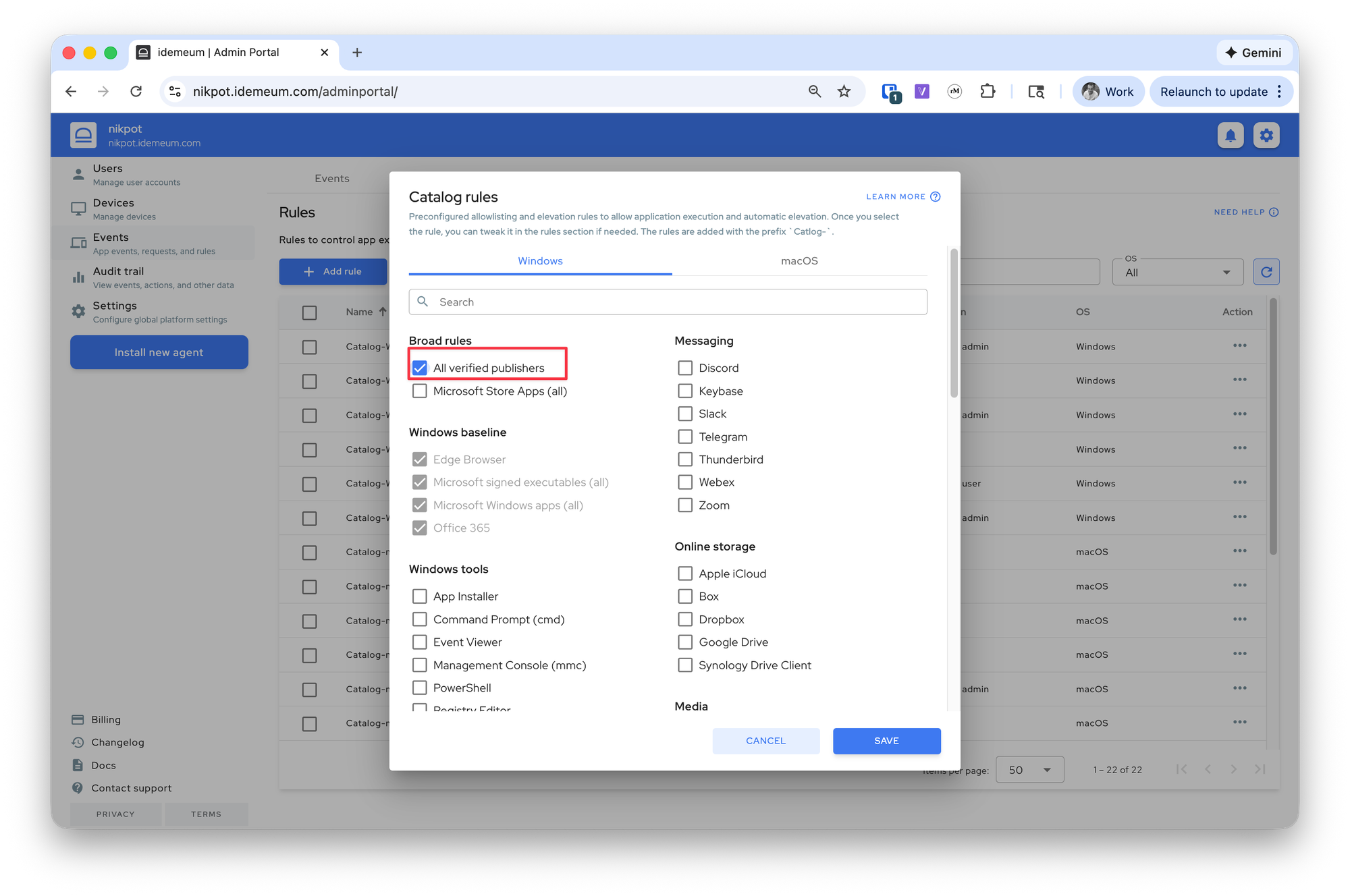 In order to mitigate this challenge idemeum offers a middle ground approach that provides a great balance between security and usability. With idemeum you can create a rule to allow all verified publishers on macOS and Windows. What that means is that any application that is legitimately signed by a verified developer (registered Windows or macOS developer) is allowed along with its dependencies.