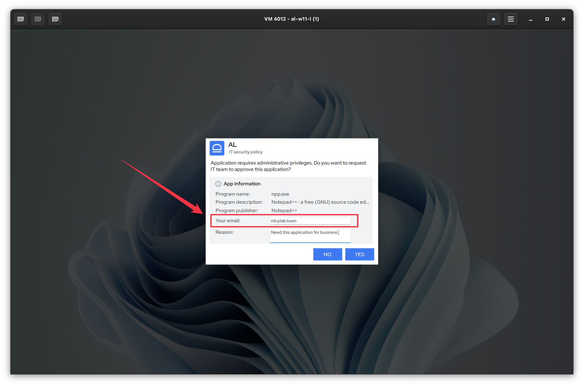 On Windows or macOS workstation users can provide the email address when requesting application elevation.